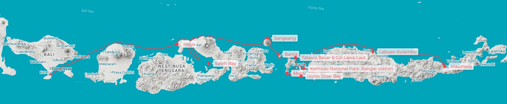 Our route will take us from Maumere in the East to Komodo sailing west to Komodo and then west again to Bali, stopping at the best dive spots along the way.
